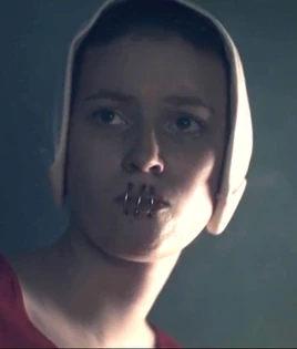 June leaves the living room of the Winslows with two Marthas, one of whom is Rita, and take her up a flight of stairs to her quarters. They tell her to stay with Ofgeorge before leaving. In the Handmaids' room, June tries to make conversation with the unusually silent Ofgeorge only to find she is unable to open her mouth because of multiple rings piercing her lips, holding them together. June is horrified by the brutal treatment.