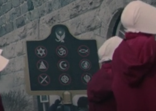 A sign in front of a Gilead Church showing banned religious and social groups