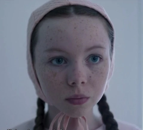 Rose has long brunette hair and freckles. She wears the standard pink dress and bonnet of Gilead girls.